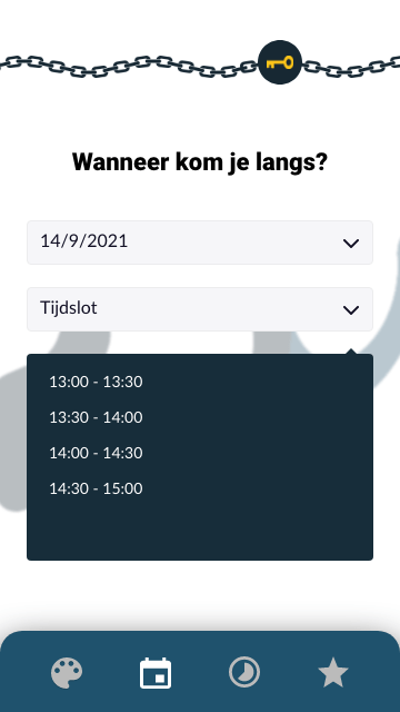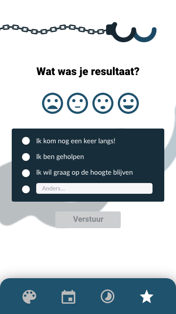 Het gesprek aangaan met een agent die luistert staat centraal. Men kan met persoonlijke ideeën en/of frustraties via de applicatie “Geboeid” een geschikte agent toegewezen krijgen voor een gesprek. Vervolgens kan er een fysieke afspraak ingepland worden in de HUB: een veilige omgeving. De applicatie kan dienen als een rode draad tijdens het gesprek. Het ondersteunt om tot een juiste conclusie en/of oplossing te komen. Bij de afspraak kan de keuze gemaakt worden om letterlijk en figuurlijk geboeid aan tafel te zitten.